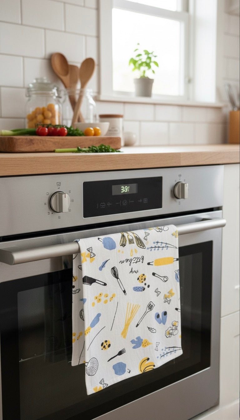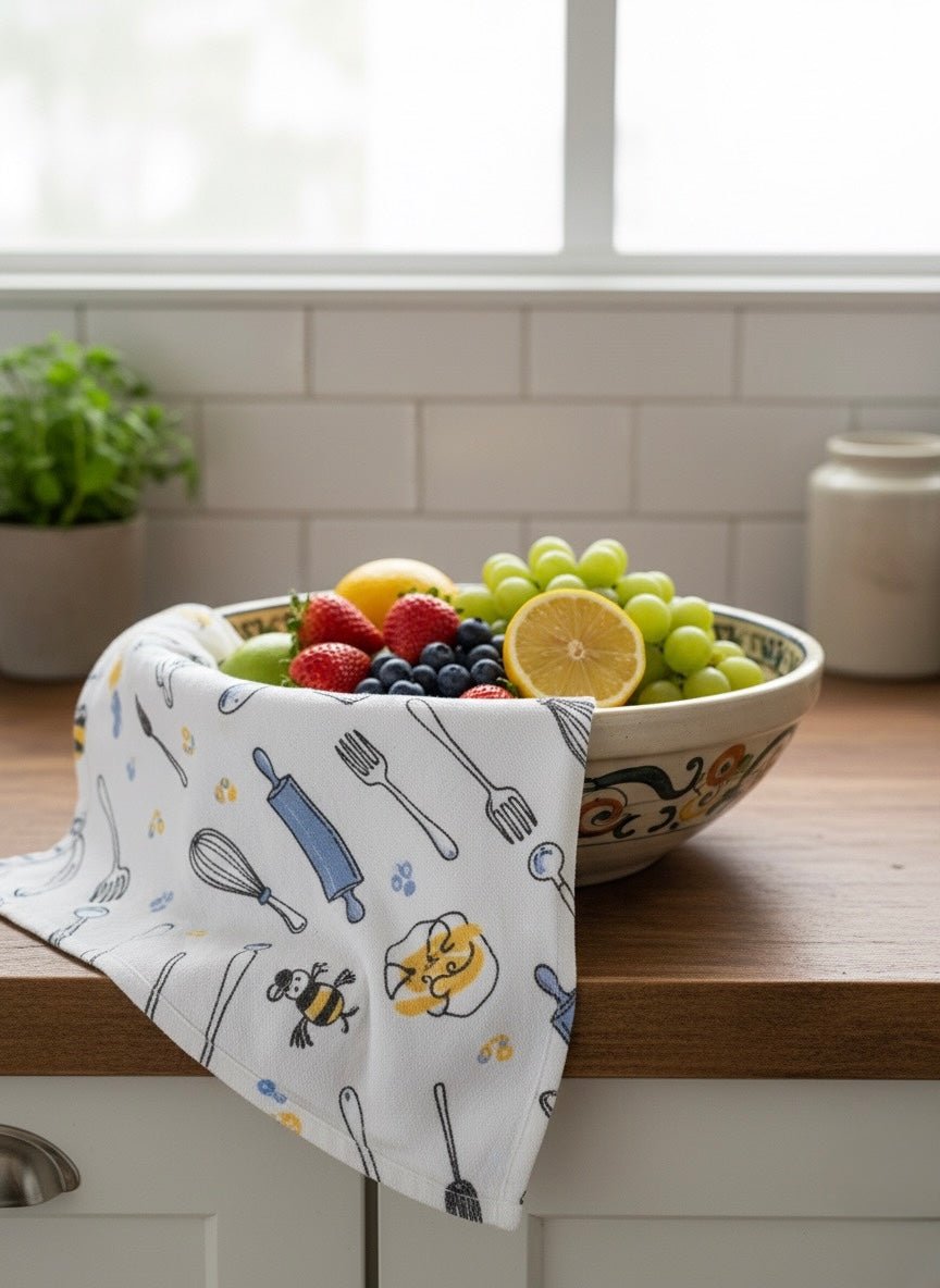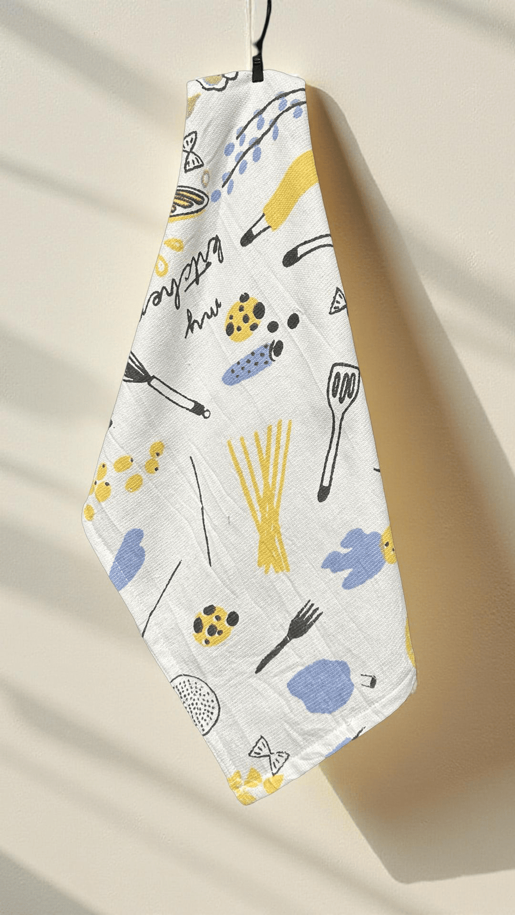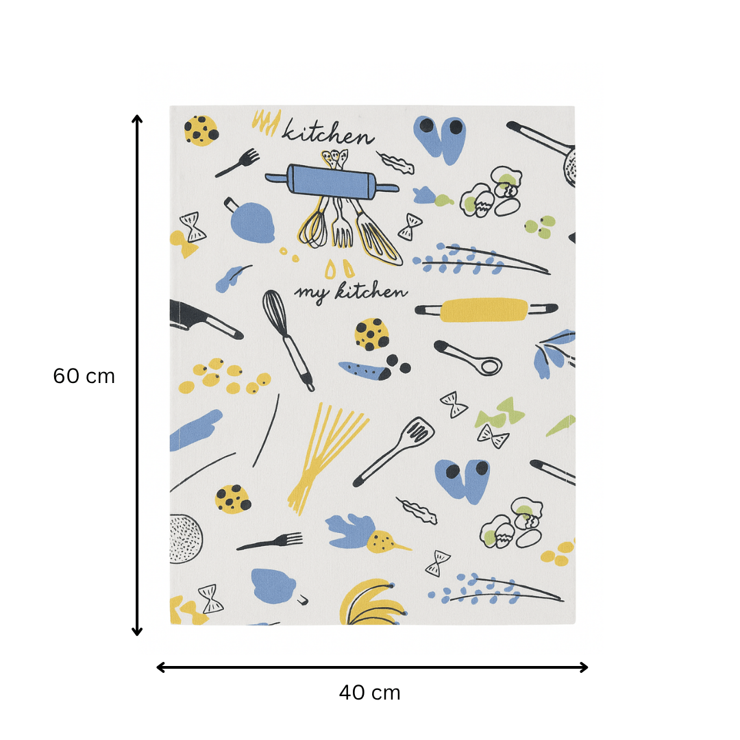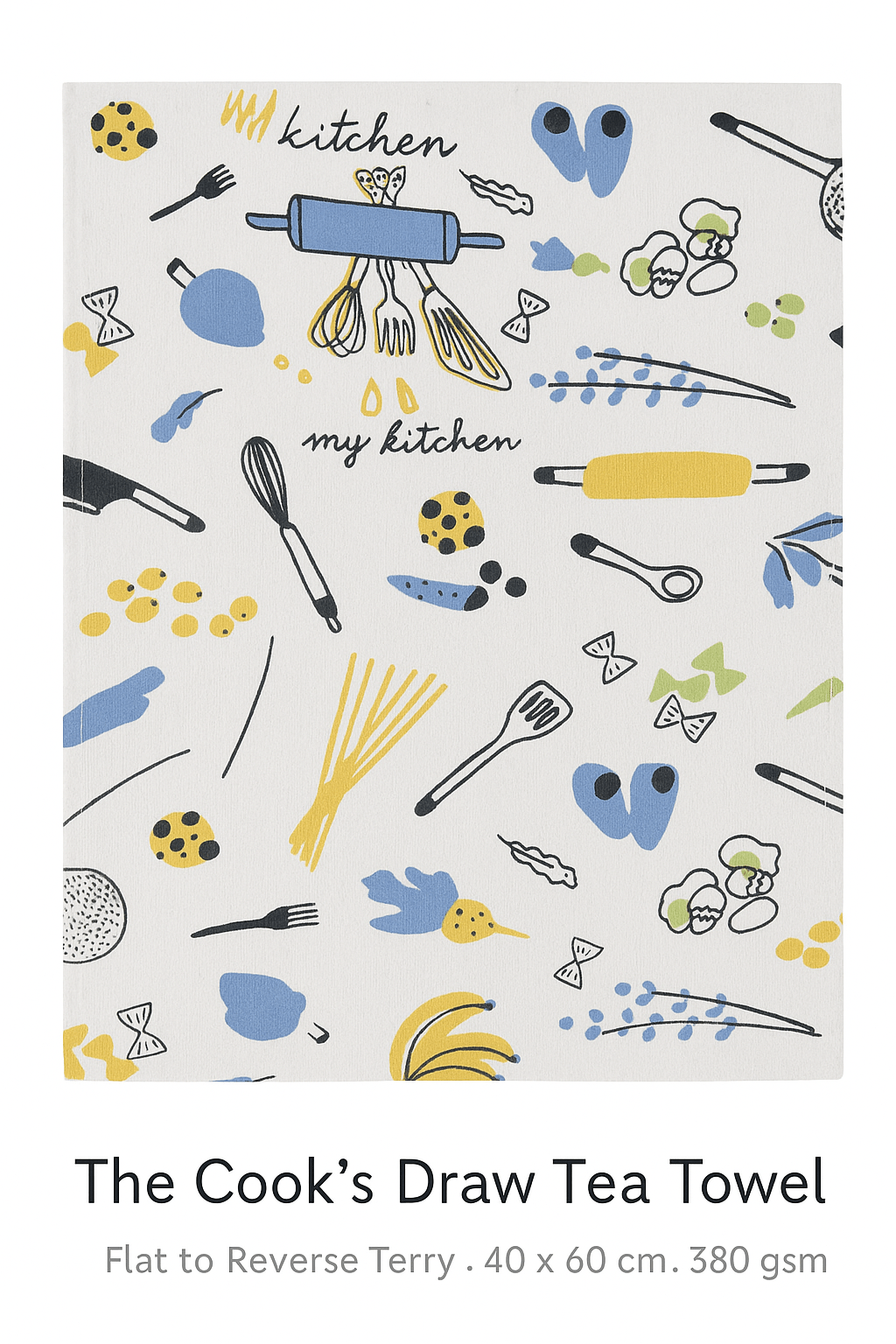 Crafted from 100% cotton with a 380 GSM weight, the Cooks Draw Tea Towel combines fun design with everyday functionality. Each towel measures 40x60 cm and features a flat-to-reverse terry weave for softness and absorbency. Printed with charming kitchen-inspired illustrations — from whisks and spatulas to pasta and bananas — it serves perfectly as a dish cloth, washcloth, tea towel, cleaning cloth, or duster. Durable and machine washable, it’s designed to handle daily spills, drying, and wiping with ease while adding a splash of personality to your kitchen.