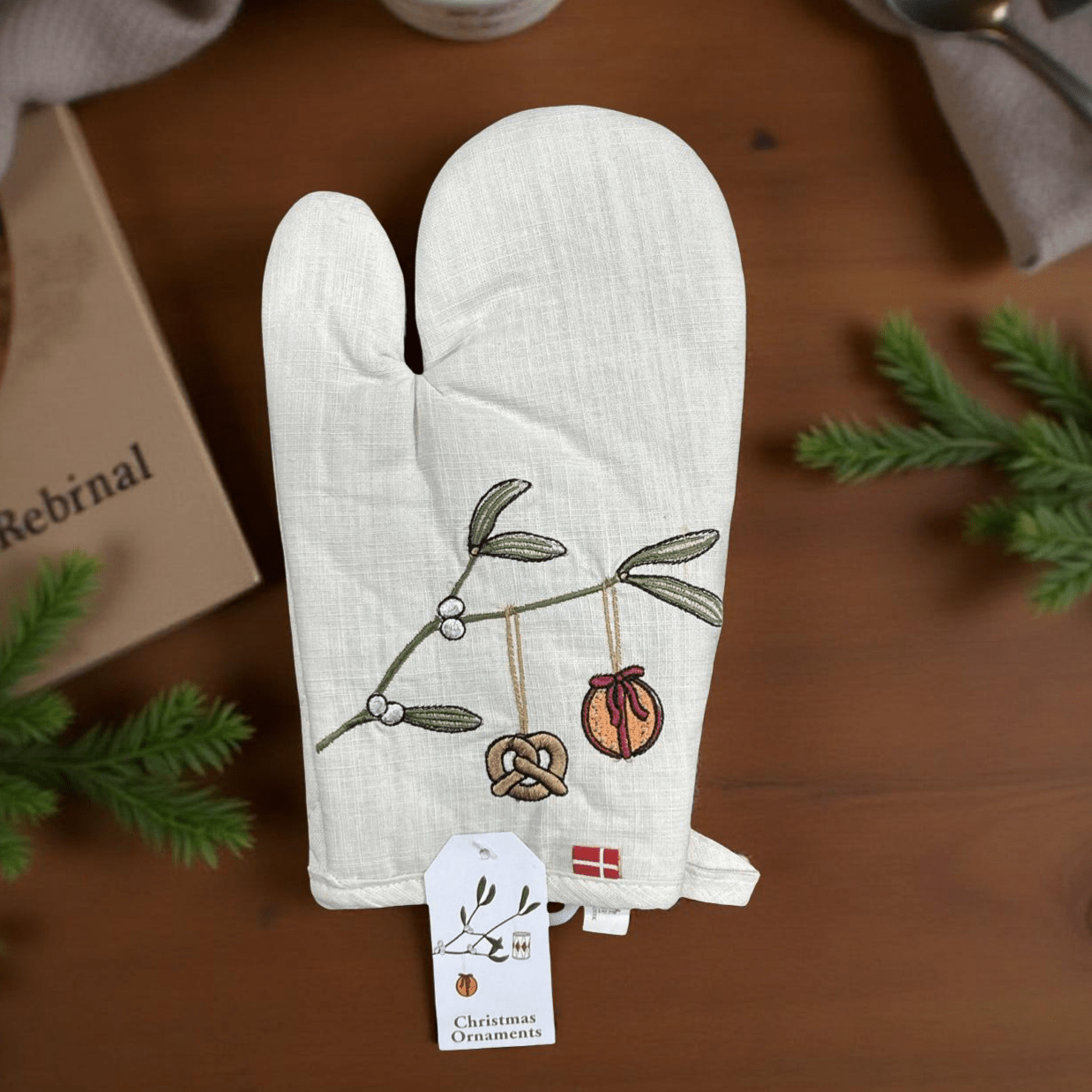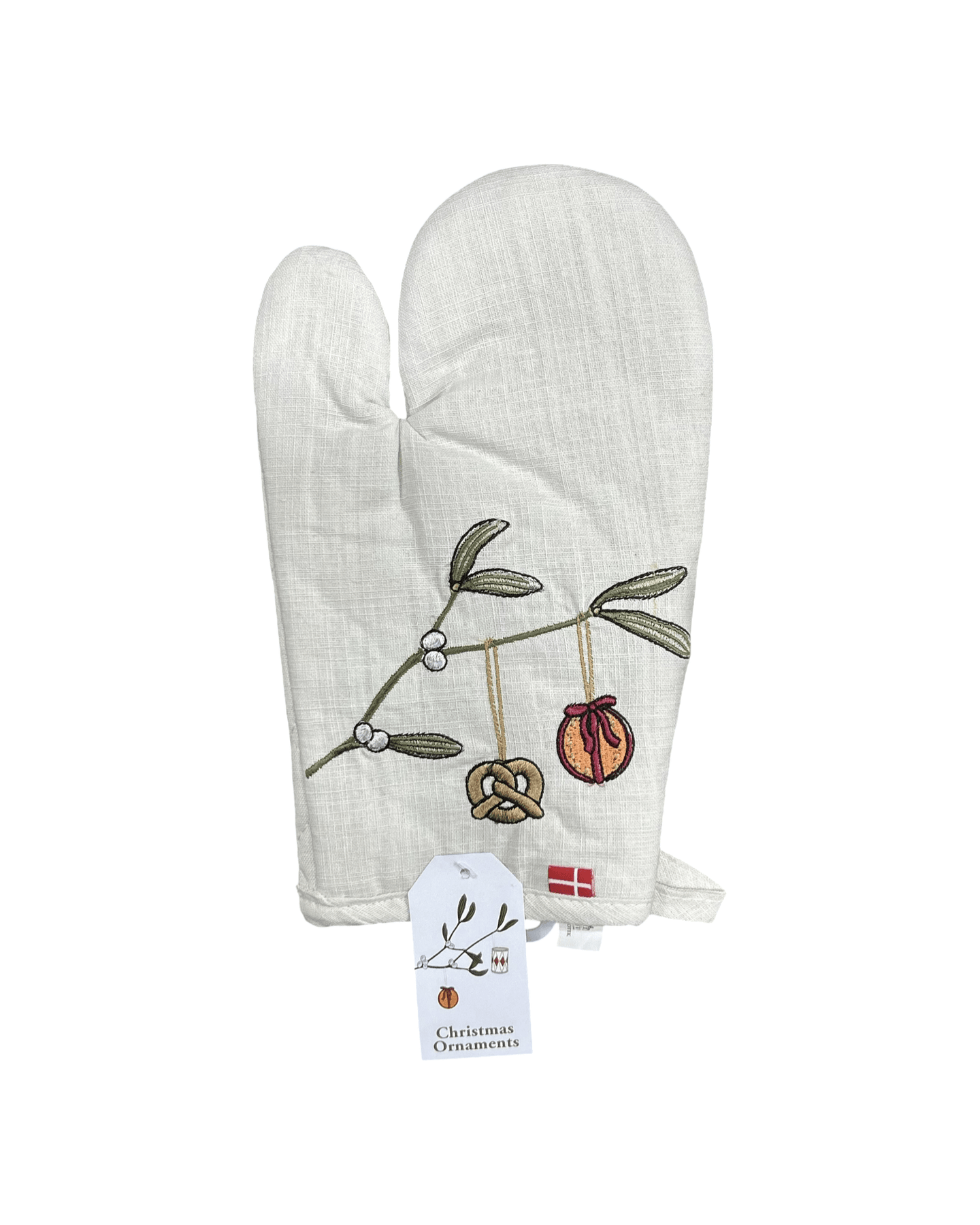 Crafted from high-quality 170 GSM cotton fabric, this 18x28 cm glove is soft, breathable, and durable – perfect for protecting your hands while baking holiday treats. The intricate embroidery features traditional Danish Christmas ornaments and mistletoe, with a nod to Scandinavian simplicity and elegance.